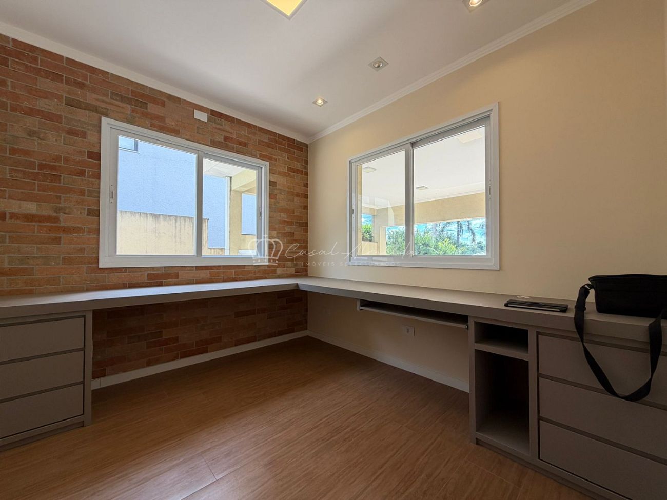 a sala com três ambientes é ampla, iluminada e integrada à cozinha planejada, que conta ainda com despensa. O escritório com móveis planejados oferece praticidade para quem precisa de um espaço reservado para trabalhar ou estudar.